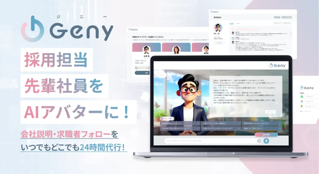 株式会社leanは、AIアバターを活用した採用プロセスの最適化を行うスタートアップ企業です。「採用担当者の分身として求職者に寄り添うAI」をコンセプトに、企業向けAIアバターGenyを開発・提供しています。
